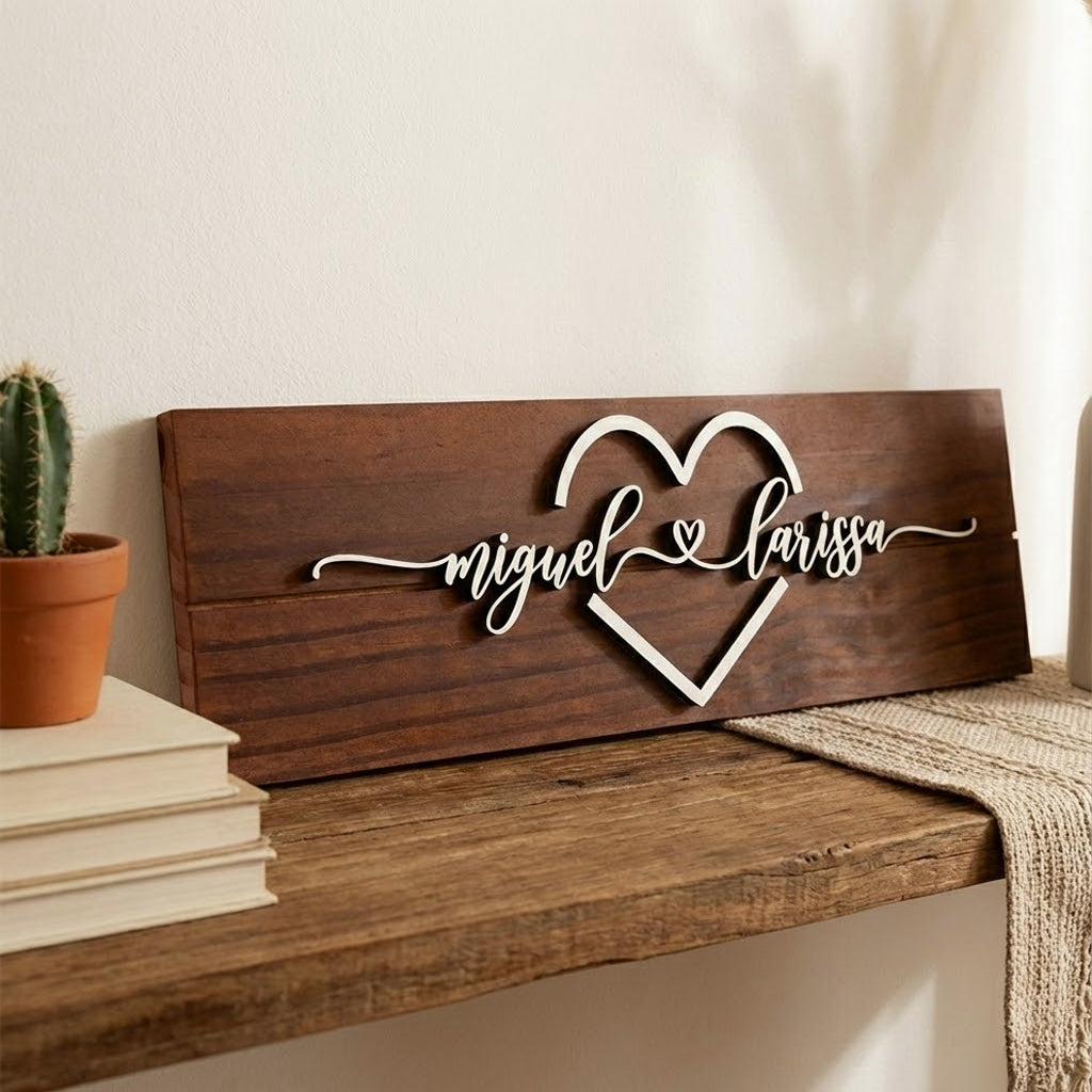 Gravada com carinho na madeira, essa placa é feita sob medida para contar a história de quem escolheu viver junto.